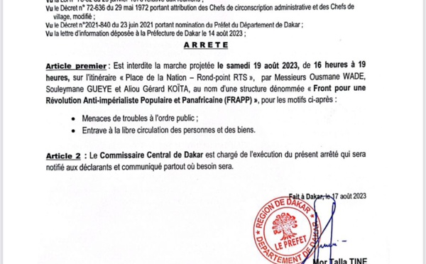 Au Sénégal, toutes les déclarations de marche ou de rassemblement de l'opposition sont systématiquement interdites par les autorités depuis plusieurs mois. Ce samedi, le Préfet de Dakar a interdit par arrêté la "marche de la libération" prévue par le FRAPP. Cette manifestation entrait dans le cadre d'une initiative avec les...