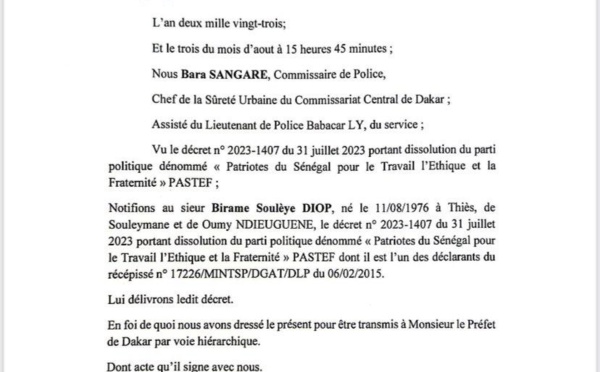 Le ministre de l’Intérieur, Antoine Diome, a publié lundi un communiqué pour annoncer la dissolution du parti Pastef par décret présidentiel. Mais c’est seulement ce vendredi que l’administrateur du parti, Biram Souley Diop, a reçu la notification de ladite dissolution par Procès-verbal fait le jeudi 03 août 2023 et signé par...
