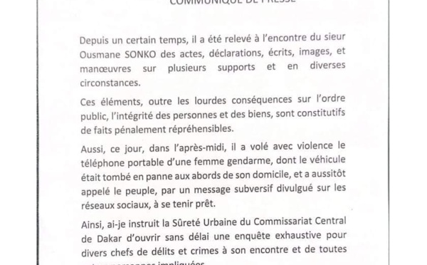 Le procureur de la République s’est fendu d’un communiqué pour donner les raisons pour lesquelles Ousmane Sonko a été interpellé ce vendredi après-midi à son domicile. Dans un communiqué partagé il y a quelques instants, le chef du parquet accuse Ousmane Sonko d’avoir « volé avec violence le portable d’une femme gendarme et...