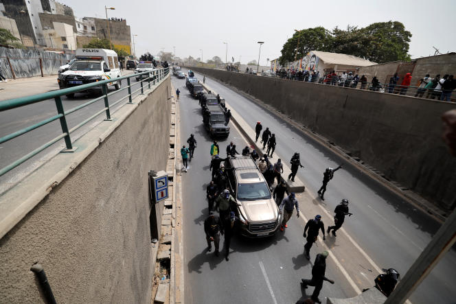 Jeudi, 13 heures 37 minutes. A l'entrée du tunnel de Soumbédioune situé à à quelques encablures du Palais de justice de Dakar. A l'entrée du tunnel de Soumbédioune, le véhicule de l'opposant Ousmane Sonko est encerclé par les Forces de défense et de sécurité. Les éléments de sa garde rapprochée sont maîtrisés et écartés, sans résistance, par les agents des corps d'élite de la police et de la gendarmerie (BIP et GIGN) dépêchés sur place pour embarquer Sonko de force dans un fourgon blindé. Il y a néanmoins certains proches du leader qui ne quittent pas la scène où règne une atmosphère très tendue. On remarque notamment, une personne âgée habillée tout en blanc, chapelet en main, qui discute avec les responsables du "commando". Il a été avec Sonko depuis son départ de son domicile.