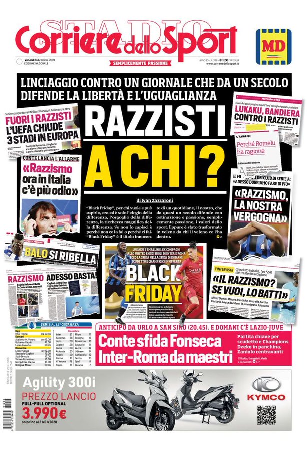 Au lendemain du tollé provoqué par sa une polémique sur Romelu Lukaku et Chris Smalling, le quotidien sportif italien Corriere dello Sport consacre deux pages à sa défense et et dénonce « un lynchage », dans son édition de vendredi. La veille, le journal avait titré « Black Friday » (« Vendredi noir ») pour annoncer la rencontre entre l'Inter Milan et AS Rome, programmée dans la soirée (20 h 45) et présentée comme un « un duel entre deux colosses de couleur », photos des deux joueurs en pleine page.