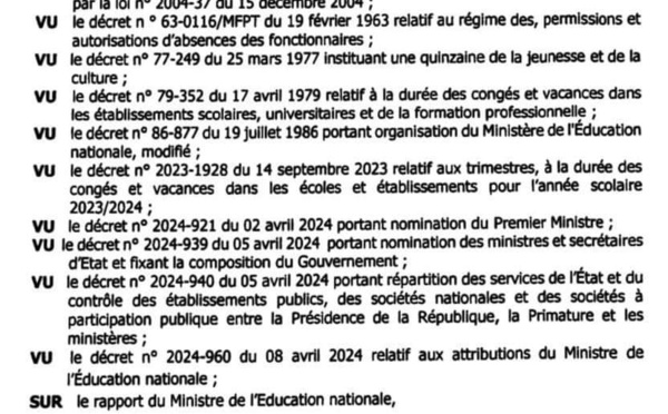 Le chef de l'Etat sénégalais Bassirou Diomaye Faye a fixé la date du démarrage de l'année académique. Dans un décret signé le 18 septembre dernier, il est indiqué que l'année scolaire démarre le 3 octobre 2024 à 8 heures et se termine le 31 juillet 2025 à 18 heures. Pour la rentrée scolaire du personnel enseignant et...