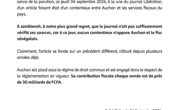 Les collaborateurs d'Auchan Sénégal et la direction de la société ont réagi à la publication, ce mercredi 04 septembre 2024, d'un article en Une du journal Libération, évoquant un prétendu contentieux entre Auchan et les services fiscaux du pays. Selon la direction d’Auchan, cet article repose sur des informations erronées,...