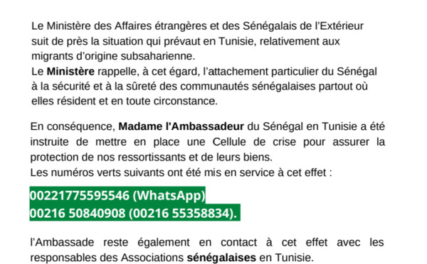 Le ministère des Affaires étrangères et des Sénégalais de l'Extérieur a enfin réagi à la situation des Sénégalais vivant en Tunisie. Les services de Aïssata Tall Sall disent "suivre de près" la situation qui prévaut en Tunisie, relativement aux migrants d'origine subsaharienne. Dans un communiqué ce dimanche, le ministère...