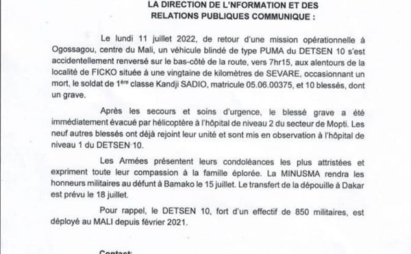 Un Casque bleu, de retour d'une mission opérationnelle à Ogossagou, centre du Mali, a perdu la vie dans un accident de la circulation. Dix (10) autres blessés ont été enregistrés dans la tragédie. La Direction de l'information et des relations publiques (Dirpa) donne les détails de l'accident, dans un communiqué rendu public ce...