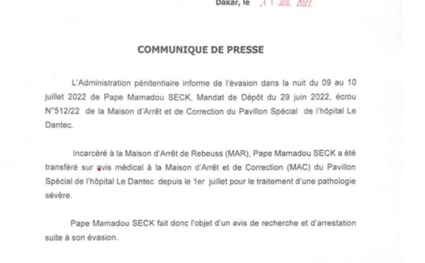 L'Administration pénitentiaire informe dans un communiqué, de l'évasion dans la nuit du 09 au 10 juillet 2022 de Pape Mamadou SECK, placé sous mandat de Dépôt du 29 juin 2022, puis écroué à la Maison d'Arrêt et de Correction du Pavillon Spécial de l'hôpital Le Dantec. Incarcéré à la Maison d'Arrêt de Rebeuss (MAR), Pape...