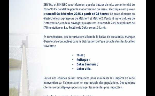 SEN’EAU et SENELEC annoncent une interruption majeure de la distribution d’eau potable à Dakar, Thiès et Rufisque, le samedi 6 décembre 2025 à partir de 8h. Cette coupure sera due à des travaux de modernisation électrique sur le poste 90 KV de Mékhé, qui alimente les stations de pompage. Selon un communiqué parvenu à...