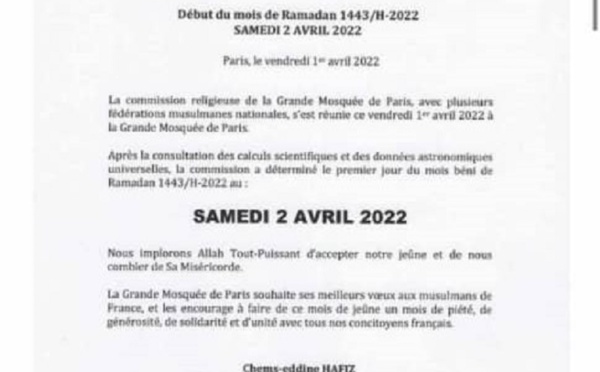 Le mois de ramadan commencera samedi en France. « Début du mois de Ramadan 1443/H-2022, samedi 2 avril 2022 », lit-on dans un communiqué de la Grande Mosquée de Paris. La commission religieuse de la Grande Mosquée de Paris avec plusieurs fédérations musulmanes nationales s’est réunie ce vendredi 1er...