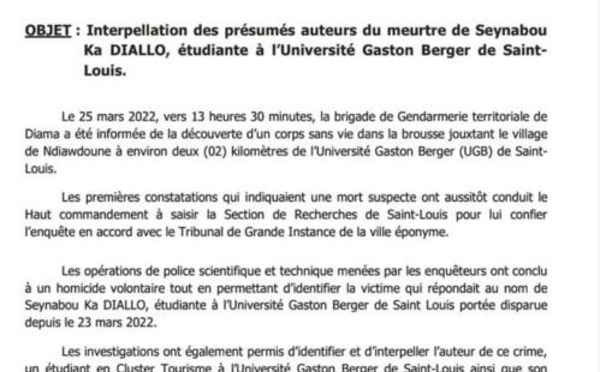 Dans un communiqué parvenu à PressAfrik, la Gendarmerie nationale annonce avoir procédé à "l’arrestation des deux présumés auteurs du meurtre de l’étudiante, Seynabou Ka Diallo". L’auteur principal du crime est un "étudiant en Cluster Tourisme de l’Université Gaston Berger". Son complice, également, étudie dans la même...