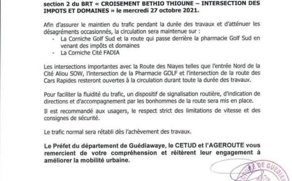 Le Ministère des Infrastructures, des Transports Terrestres et du Désenclavement, à travers le CETUD et AGEROUTE, informe du démarrage des travaux sur la sous section 2 du Bus rapide transit "BRT" au croisement Béthio Thioune - Intersection des Impôts et Domaines le mercredi 27 octobre 2021. Afin d'assurer le maintien du trafic...
