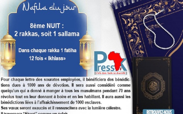 8eme nuit : 2 Rakkas soit 1 sallama. Dans chaque rakka, le croyant doit réciter 1 Fatiha et 12 fois "Ikhlass". Recommandation : Pour chaque lettre des sourates employées, il bénéficiera des bénédictions dues à 1000 ans de dévotion. Il sera aussi considéré comme quelqu’un qui a donné à manger à tous les musulmans pendant 70...