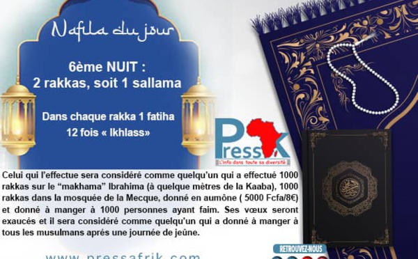 6ème Nuit : 2 Rakkas soit 1sallama. Dans chaque rakka, il doit réciter 1 Fatiha et 12 fois « Ikhlass » Recommandation: Celui qui l’effectue sera considéré comme quelqu’un qui a effectué 1000 rakkas sur le “makhama” Ibrahima (à quelque mètres de la Kaaba), 1000 rakkas dans la mosquée de la Mecque, donné en aumône ( 5000...