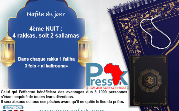 4ème nuit: Le croyant doit accomplir 4 rakkas, soit 2 sallamas. Dans chaque rakkas, il doit réciter à haute voix 1 fatiha et 3 fois « Al kafirouna». Recommandations : Celui qui l’effectue bénéficiera des avantages dus à 1000 personnes s’étant acquitté de toutes leurs dévotions. Il sera absous de tous ses péchés...