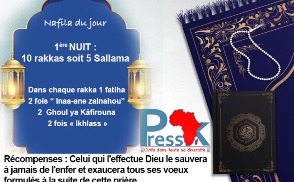 Le croissant lunaire aperçue dans plusieurs localités au Sénégal, le ramadan démarre ce mercredi 13 avril 2021. Dix (10) rakkas doivent être accomplies pour ce premier jour. 1ère nuit: Le croyant doit accomplir 10 rakkas, soit 5 sallama. Dans chaque rakka, il doit réciter à haute voix : 1 fois le Chapitre «Fatiha», 2...