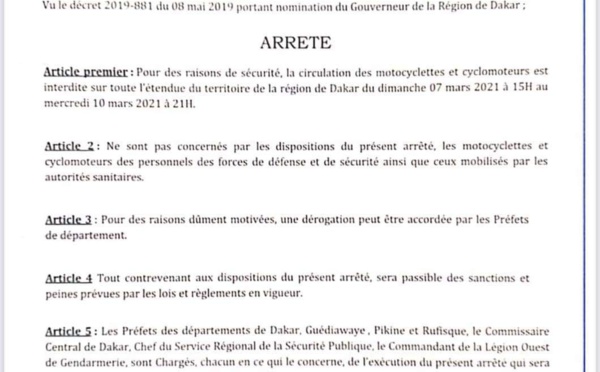 Le Gouverneur de Dakar Al Hassan Sall, dans un arrêté publié ce dimanche 7 mars interdit la circulation des motocyclettes et cyclomoteurs sur toute l’étendue de la région de Dakar pour des raisons de sécurité à partir du dimanche 7 mars à 15h jusqu’à mercredi 10 mars à 21h. Toutes violation de cet arrêté "sera passible des...