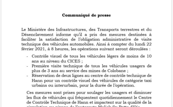 Dans le but de faciliter aux usagers les visites techniques de leurs véhicules, le ministère des Transports terrestres a décidé de créer deux centres secondaires à Colobane et au Cices pour désengorger celui de Hann du flux de véhicules qui le fréquentent au quotidien. Dans un communiqué parcouru par PressAfrik, le ministre...