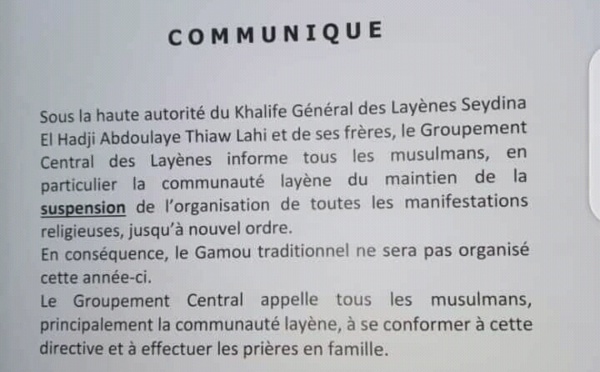 A travers un communiqué signé le président du groupement central des Layènes, qui sous la haute autorité du Khalife général Seydina El Haj Abdoulaye Thiaw Laye et ses frères, l'opinion nationale et les fidèles sont informés de la suspension de toutes les manifestations religieuses jusqu'à nouvel ordre. En conséquence, note le...