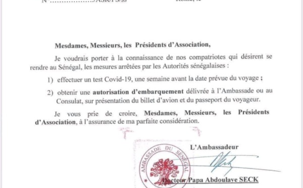 Pour les Sénégalais résidents en Italie qui désirent venir au Sénégal, il est désormais obligatoire de faire le test de la Covid-19, une semaine avant le voyage et se munir d'une autorisation d'embarquement. Ce sont les nouvelles mesures mises en place par les autorités diplomatiques.