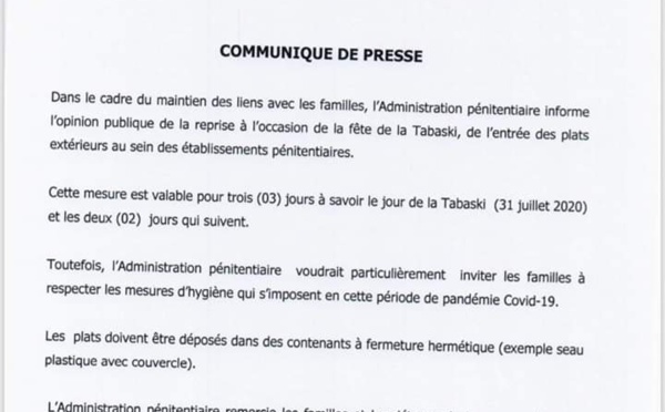 L’Administration pénitentiaire du Sénégal va ouvrir ses portes aux familles des détenus dans la période du Tabaski pour faire entrer des repas préparés de l’extérieur. Cette mesure va s’étendre du 31 au 02 juillet, selon le document parvenu à PressAfrik. Toutefois, l’Administration pénitentiaire recommande aux familles...