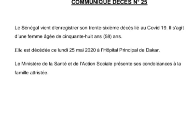 Le décompte macabre se poursuit. Le Sénégal vient d'enregistrer un trente-sixième (36) décès lié au covid-19. Il s'agit d'une femme âgée de 58 ans. Décès survenu ce lundi 25 mai 2020 à l'hôpital Principal de Dakar.
