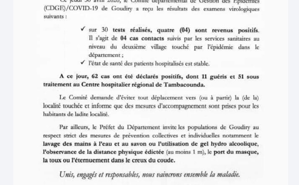 Le préfet du département de Goudiry, dans la région de Tambacounda (est) a fait le point sur la situation du Coronavirus dans cette localité fortement touchée. Sur 30 tests réalisés, 4 sont revenus positifs, tous des cas contacts suivis. Par ailleurs, 11 patients ont été déclarés guéris et 51 sous traitement dans le centre...