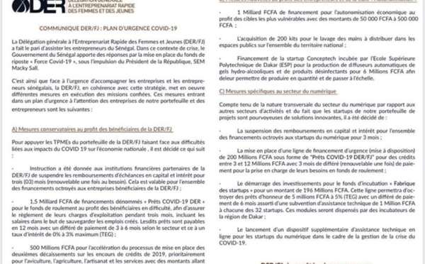 La Délégation Générale à l’Entreprenariat Rapide des Femmes et des Jeunes Der/FJ a donné instructions aux institutions financières partenaires de la DER / FJ de suspendre les remboursements d’échéance en capital et intérêt pour trois mois (renouvelable une fois au besoin), ce en raison des difficultés liées au Coronavirus. Une...