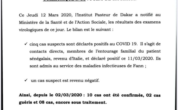 Le ministère de la Santé et de l’Action sociale a confirmé jeudi la contamination de cinq (5) nouvelles personnes au coronavirus, des proches du Sénégalais contrôlé la veille positif au Covid-19 après être rentré d’Italie. Ces nouvelles infections portent à 10 le nombre de patients atteint du coronavirus au Sénégal dont...