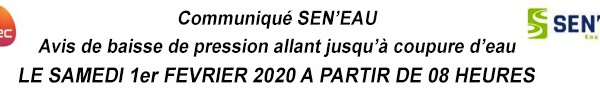 SEN’EAU (EAU DU SENEGAL), SENELEC ET SONES VOUS INFORMENT, QU’EN RAISON DES TRAVAUX D’ENTRETIEN SUR LA LIGNE HAUTE TENSION DE SAKAL PREVUS LE SAMEDI 1er FEVRIER 2020 A PARTIR DE 08 HEURES, L’USINE DE PRODUCTION D’EAU POTABLE DE KEUR MOMAR SARR SERA EN...
