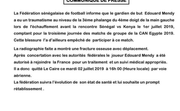 Le gardien de but titulaire de l'équipe nationale du Sénégal Edouard Mendy s'est blessé hier lundi à l'échauffement, quelques minutes avant la rencontre contre le Kenya. D'après la Fédération sénégalaise de football, qui a produit un communiqué, ce mardi 02 juillet 2019, "la radiographie faite a montré une fracture osseuse avec...