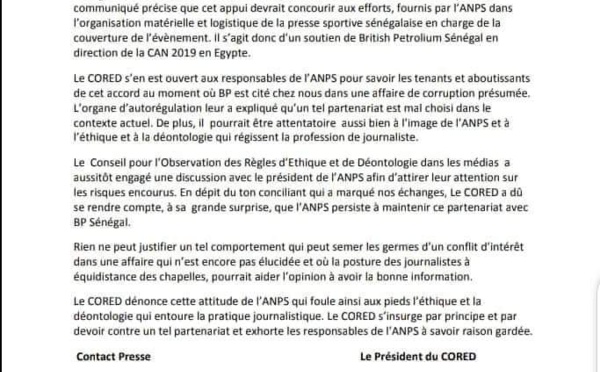 Dans un communiqué parvenu à PressAfrik, le Comité d’Observation des Règles d’Ethique et Déontologie (CORED) a fustigé le partenariat signé entre l’Association nationale de la presse sportive (Anps) et l’entreprise Bp, citée dans le scandale de corruption présumé révèle par la BBC, sur les contrats pétroliers et gaziers au...