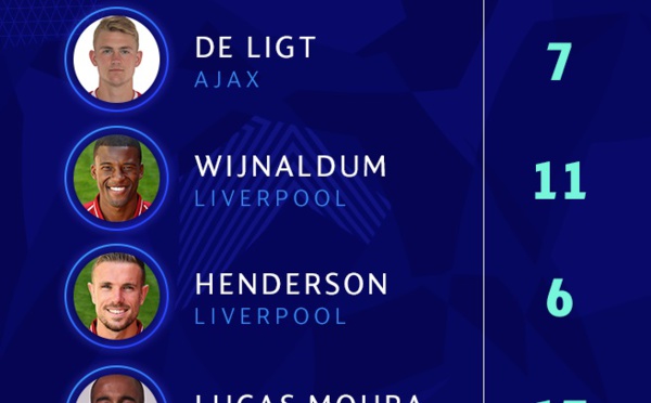 L'UEFA a officialisé le onze idéal d'inoubliables demies retour de l'édition 2018-19 de Ligue des champions. Le fait qu'il y a plus de joueurs de l'Ajax que de Tottenham surprend, alors que Liverpool place six joueurs. Gardien : Alisson Becker (Liverpool) – 7 points Défenseur : Trent Alexander-Arnold...