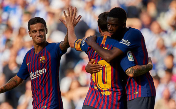 Et de quatre pour le FC Barcelone. Le club catalan a décroché un quatrième succès en autant de journées de Liga ce samedi sur la pelouse de la Real Sociedad (2-1). Menés au score sur un but d'Aritz Elustondo (12e), les Blaugrana ont renversé leur adversaire grâce à Luis Suarez (63e) et Ousmane Dembélé (66e).