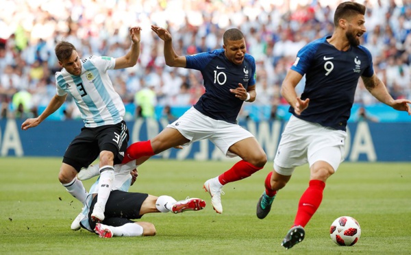 Sur un impressionnant rush solitaire de plus de 40 mètres, Kilyan Mbappé, la défense argentine est supposée. Rojo accroche bêtement l'attaquant parisien dans la surface de réparation et la'rbitre désigne le point de penalty. Griezmann transforme sans trembler. (1-0)