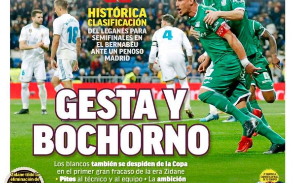 Découvrez les Unes des principaux journaux sportifs espagnols de ce jeudi 25 janvier 2018. MARCA Hier soir a eu lieu la classification historique de Leganés face au Real Madrid. Les 'merengues' se sont fait éliminer de la Coupe du Roi dans leur propre stade après avoir remporté le match-aller 0-1. AS La défaite du Real Madrid...