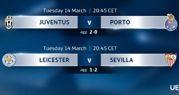 Victorieuse 2-0 à l'aller, la Juventus de Turin est en passe de sa qualifier, ce soir, sauf surprise face à Porto. L'autre affiche de ces huitièmes de finale retour de la Ligue des Champions beaucoup plus indécis, oppose Leicester à Sévilla. Malheur au vaincu. Tweets sur #ucl
