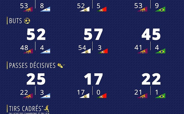 BALLON D'OR - Qui a inscrit le plus de buts ? Qui a distribué le plus de passes décisives ? Qui a remporté le plus de trophées ? La réponse avec notre infographie qui compile toutes les principales statistiques de Lionel Messi, Cristiano Ronaldo et Neymar sur l'année civile écoulée. Nous sommes désormais habitués à...