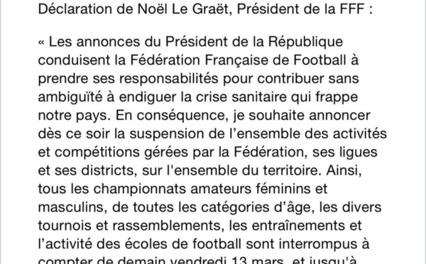 Le président de la Fédération française de football, Noël Le Graët, a annoncé ce jeudi soir la suspension de toutes les compétitions amateurs. Cela concerne aussi la D1 féminine, dont le PSG - Lyon de samedi. Dans la foulée de la déclaration du président de la République, Emmanuel Macron, au sujet de la pandémie de coronavirus,...