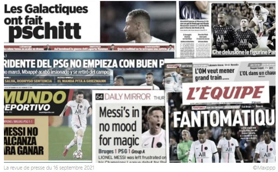 Toute l'Europe regardait le match du PSG, des étoiles dans les yeux. Et le moins que l'on puisse dire, c'est que c'est la déception qui domine dans les journaux du continent. En témoigne, la Une du Corriere dello Sport. «Quelle désillusion», peut-on lire en couverture du quotidien transalpin. En Belgique, La Dernière Heure reste sobre et titre «Bruges fait plier l'armada du PSG». En Espagne, vous vous en doutiez, le résultat fait les gros titres. Pour Mundo Deportivo, «Messi ne suffit pas pour gagner». Alors que pour Sport, c''est le trio global qui est visé: «le trident du PSG ne part pas du bon pied», titre ainsi le journal catalan. Selon As, c'était carrément une «nuit d'Halloween». Enfin, outre-Manche, les tabloïds sont plus mesurés à l'image du Daily Mirror qui a vu un Messi «pas d'humeur magique».