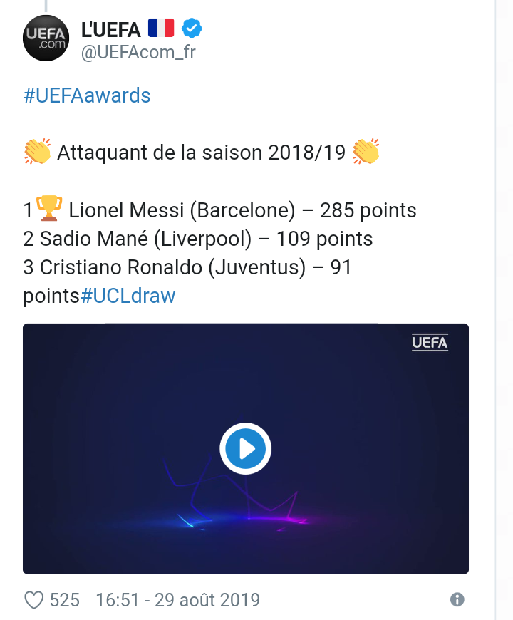 L’UEFA a rendu public le nombre de voix obtenus par chaque prétendant après la cérémonie de tirage au sort de la LDC. Avec 109 points, Sadio Mané se hisse à la deuxième derrière Lionel Messi (285 pts) et devant Cristiano Ronaldo (91 pts).