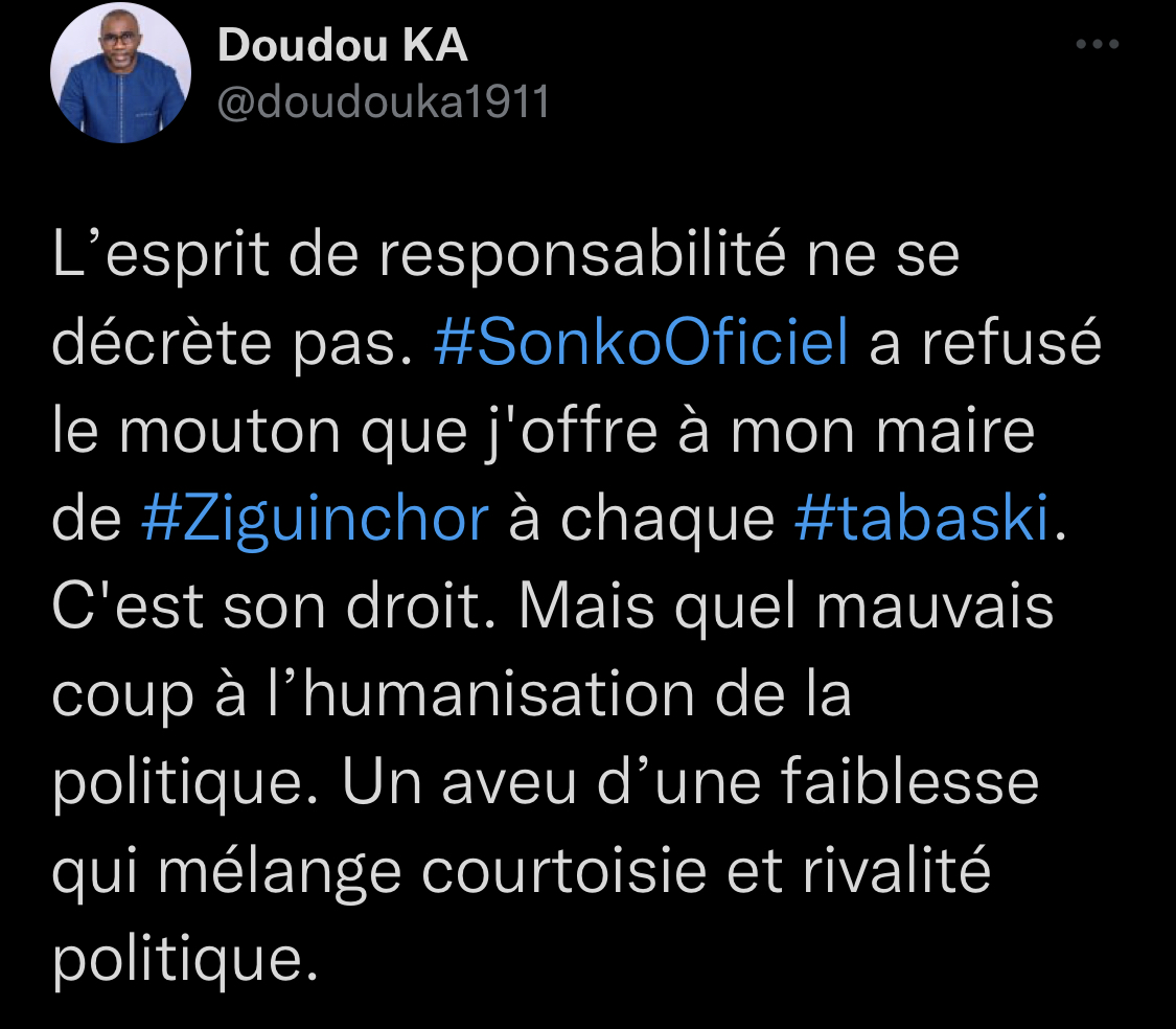 « L’esprit de responsabilité ne se décrète pas. #SonkoOficiel a refusé le mouton que j'offre à mon maire de #Ziguinchor à chaque #tabaski. C'est son droit. Mais quel mauvais coup à l’humanisation de la politique. Un aveu d’une faiblesse qui mélange courtoisie et rivalité politique », a-t-il écrit sur le réseau social.