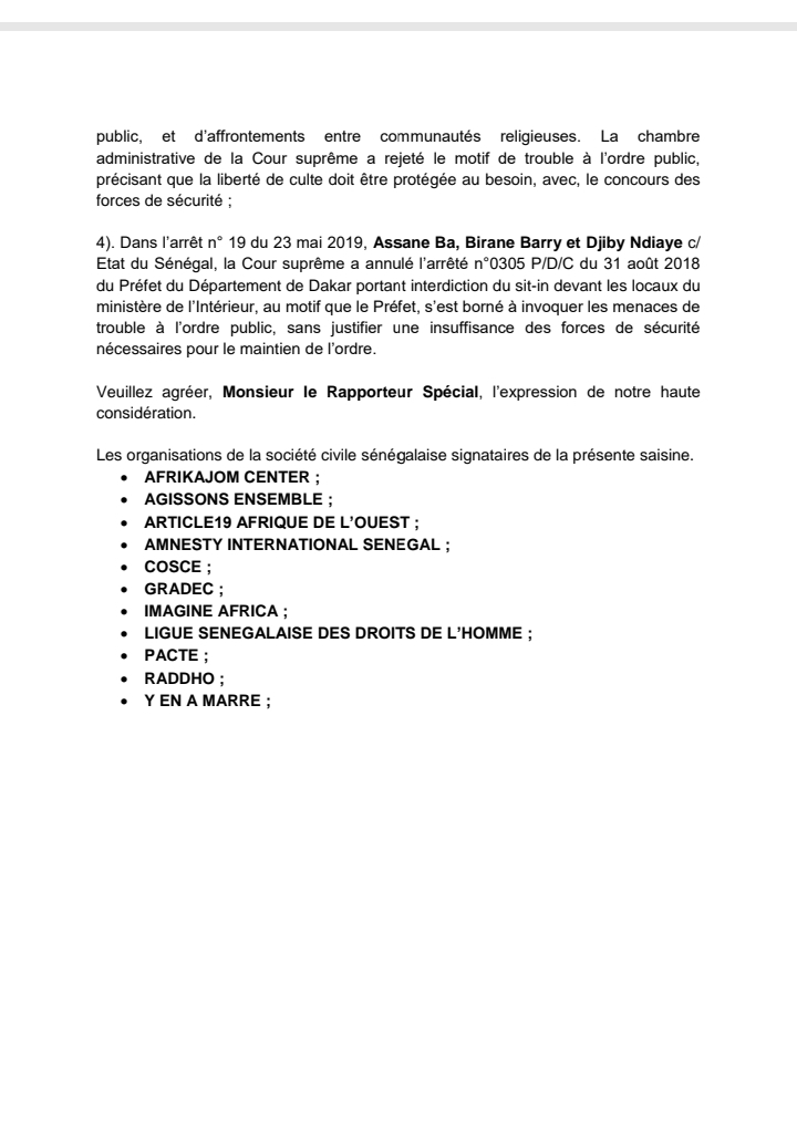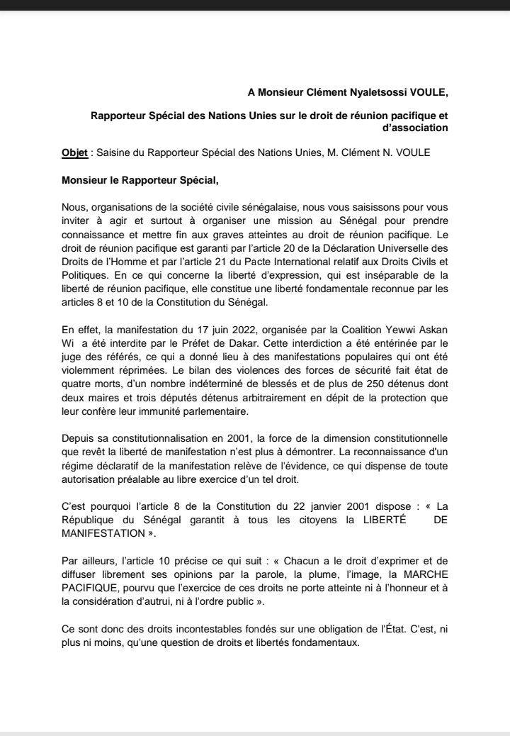 Onze (11) organisations de la société civile sénégalaise dont le mouvement Y en a marre, Amnesty International ou AfricaJom center ont saisi d’une lettre, le rapporteur spécial des Nations Unies sur le droit de réunion pacifique et d’association.