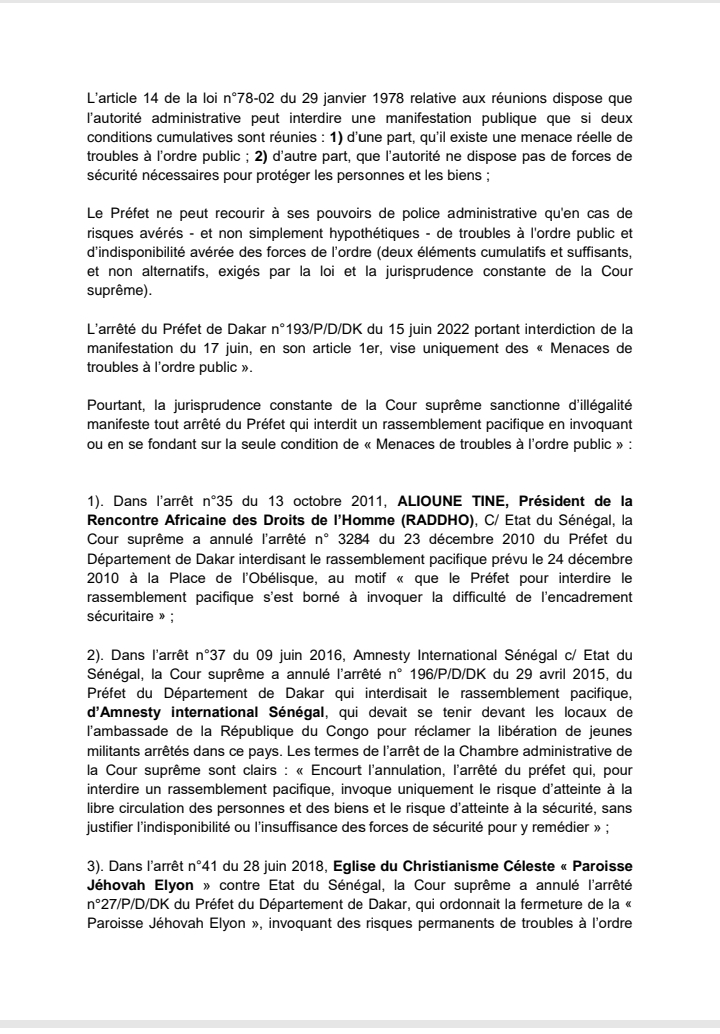 En effet, Y en a marre et autres organisations ont rappelé dans la lettre que la manifestation de la coalition Yewwi Askan Wi de l’opposition a été interdite par le préfet de Dakar. Et celle-ci a été entérinée par le juge des référés, ce qui a donné lieu à des manifestations violemment réprimées.