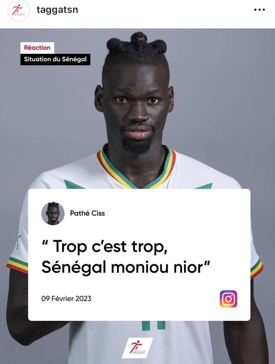 L'international Sénégalais, Pathé Ciss s'est joint à la cohorte des personnalités qui condamnent les violences perpétrées sur les manifestants. Le milieu de terrain des lions s'est exprimé sur son compte instagram en ces termes : " trop c'est trop, Sénégal moniou nior". Un message repris également par le site taggatsn.